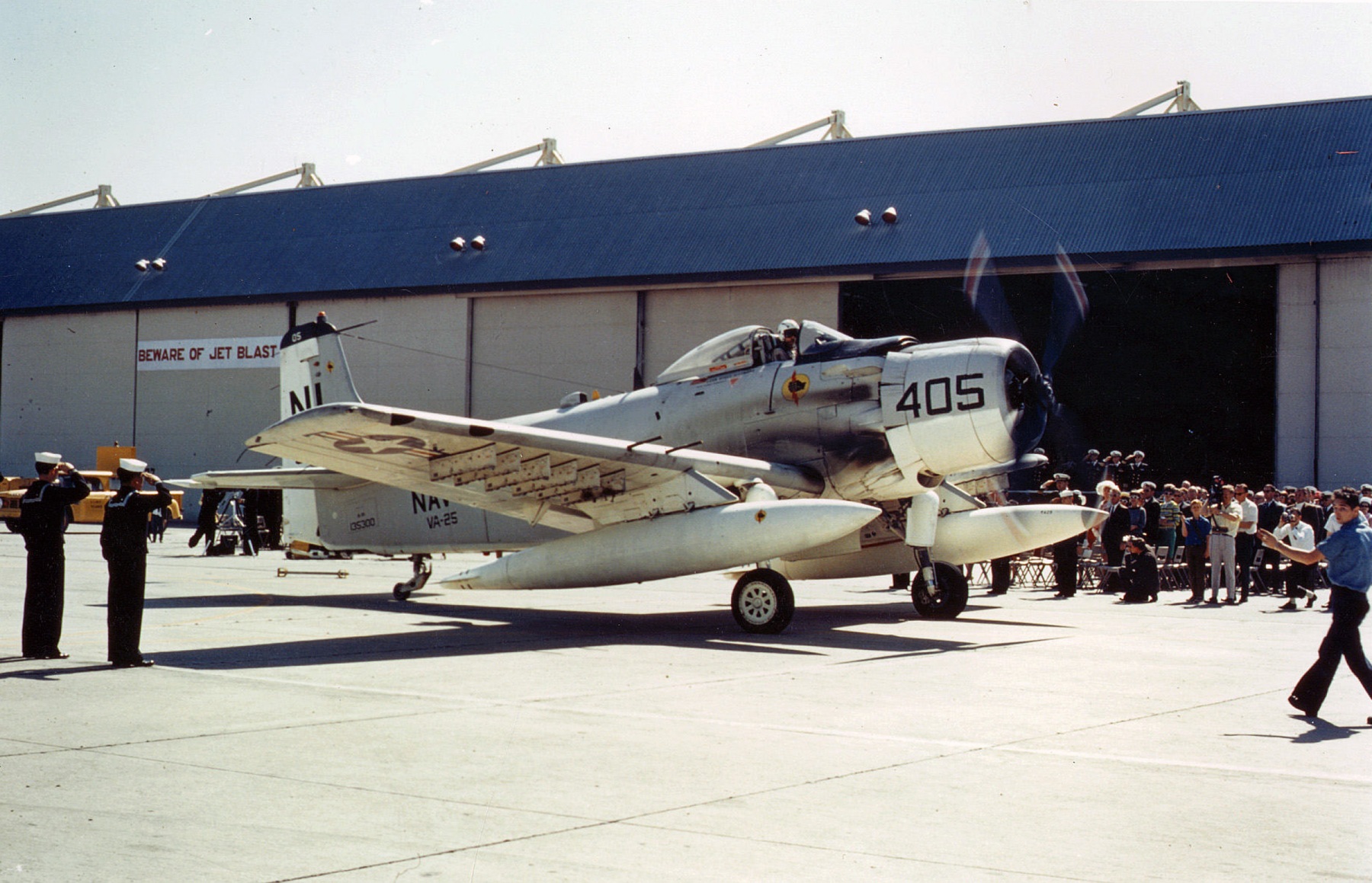 The museum's A-1H Skyraider (Bureau Number 135300) passes between traditional sideboys during its retirement ceremony at NAS Lemoore, CA, in 1968.