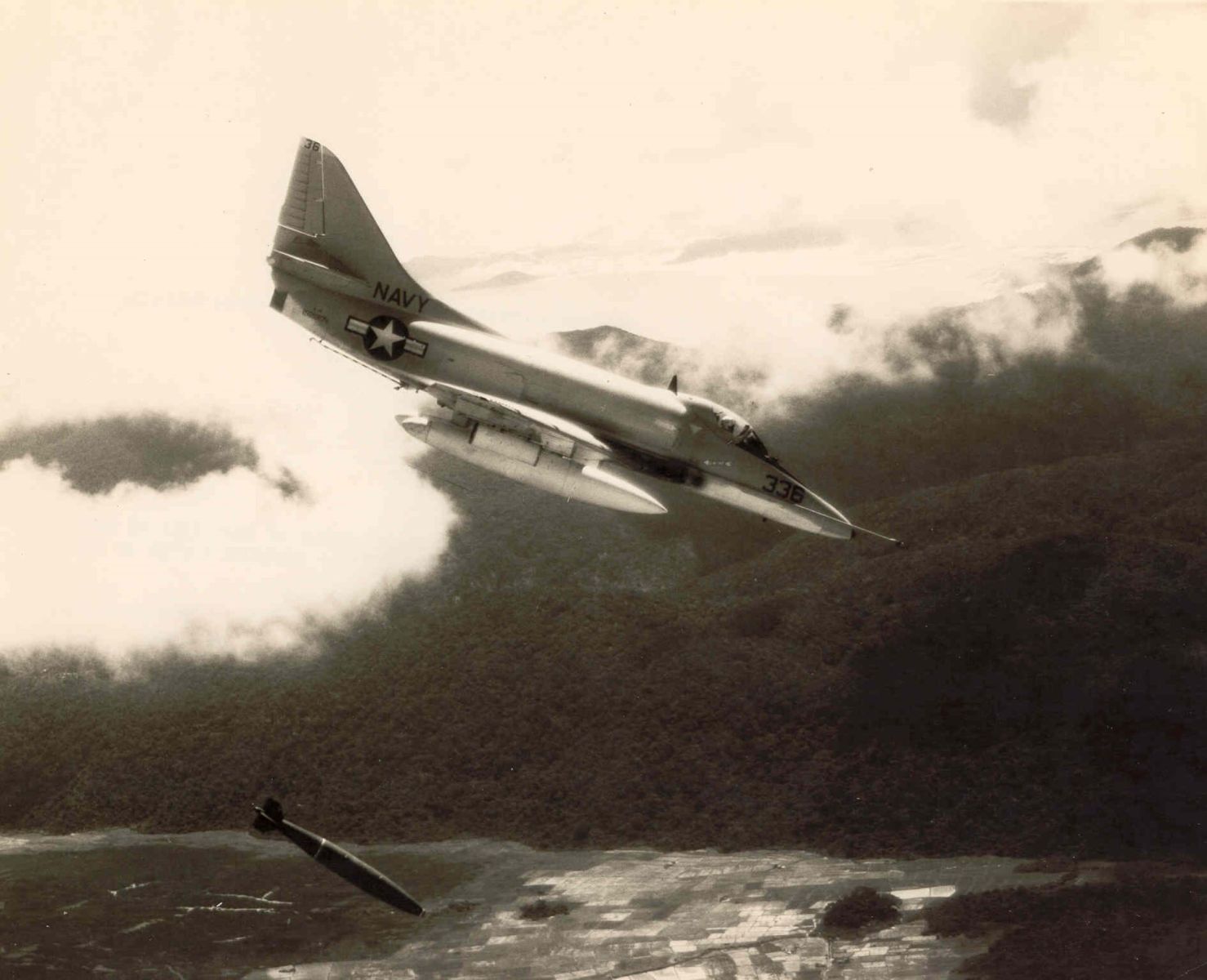 A-4s participated in the first strikes of the Vietnam War in response to attacks against American destroyers in the Tonkin Gulf in August 1964. In the skies over Vietnam, Skyhawks logged more combat missions than any other naval aircraft, including notable strikes against bridges and power plants in North Vietnam and close air support of troops engaged in ground combat in South Vietnam. Among those who flew the aircraft was Lieutenant Commander Michael Estocin, who during a flight on April 20, 1967, neutralized three surface-to-air missile sites in a strike over Haiphong, North Vietnam, and subsequently made a fiery carrier landing in his badly damaged A-4. Shot down five days later, he received the Medal of Honor posthumously.