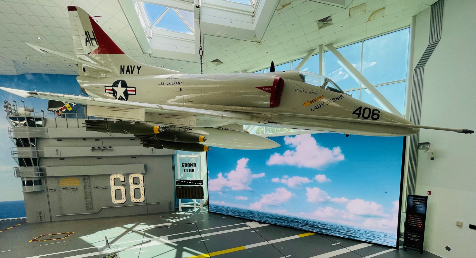 Four examples of the A-4E/F Skyhawk displayed in the museum “fly” in diamond formation as centerpieces of the Blue Angel Atrium. Three of the four actually flew flight demonstrations with the team. All four aircraft flew multiple combat tours with Navy and Marine Corps squadrons during the Vietnam War. An A-4E displayed at the museum entrance honors the Vietnam-era VA-163 Saints and VA-164 Ghost Riders. It once flew as an adversary at TOPGUN.