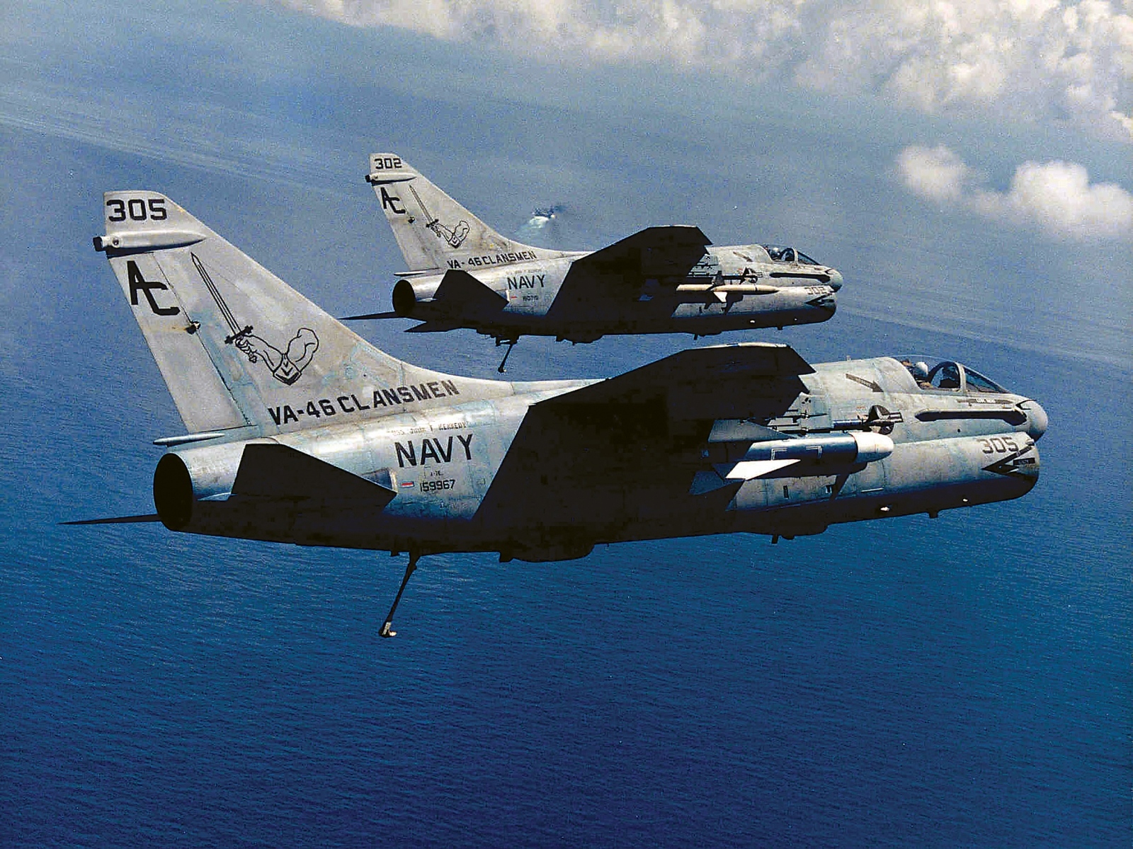 A-7E Corsair IIs assigned to the VA-46 Clansmen pictured with hooks down as they return to USS John F. Kennedy (CV 67) during Operation Desert Storm.