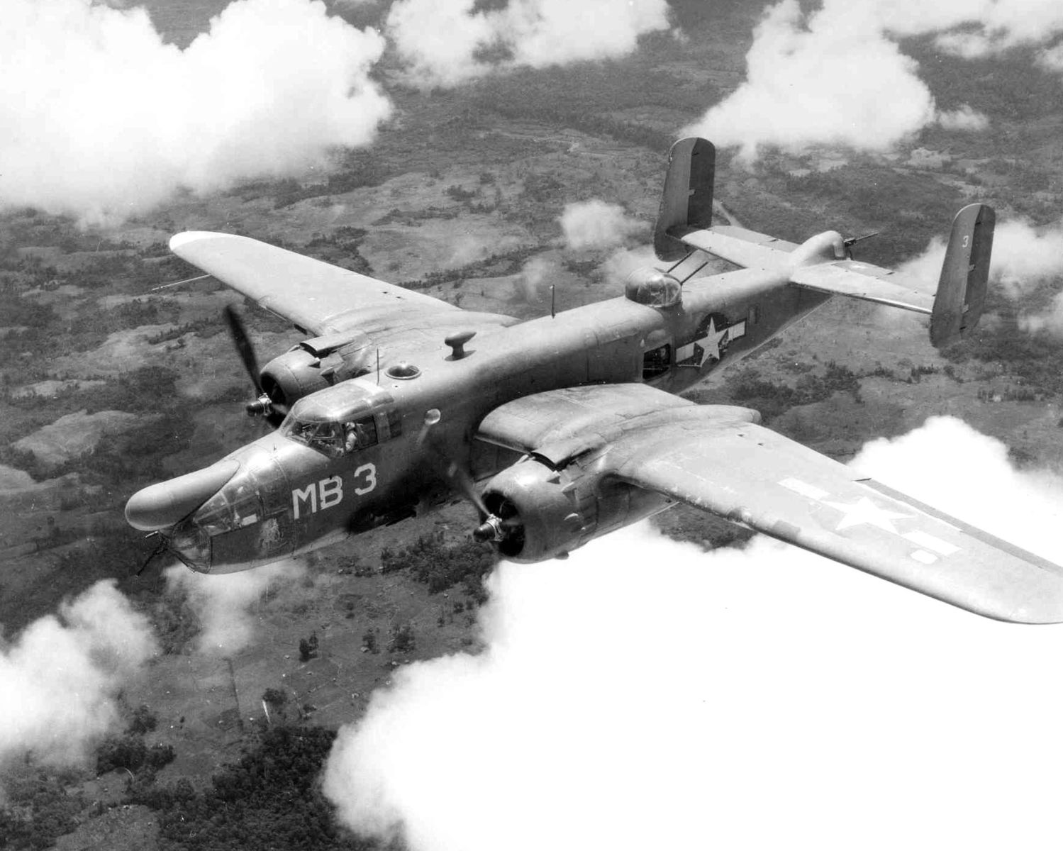 A naval version of the B-25 operated with Marine Corps squadrons during World War II. Deliveries of this version, designated the PBJ, began in February 1943 and the type equipped a number of Marine bombing squadrons (VMB) in the Pacific. Modifications included increased armament in the nose for low-level attack and equipping the aircraft with radar for night missions.