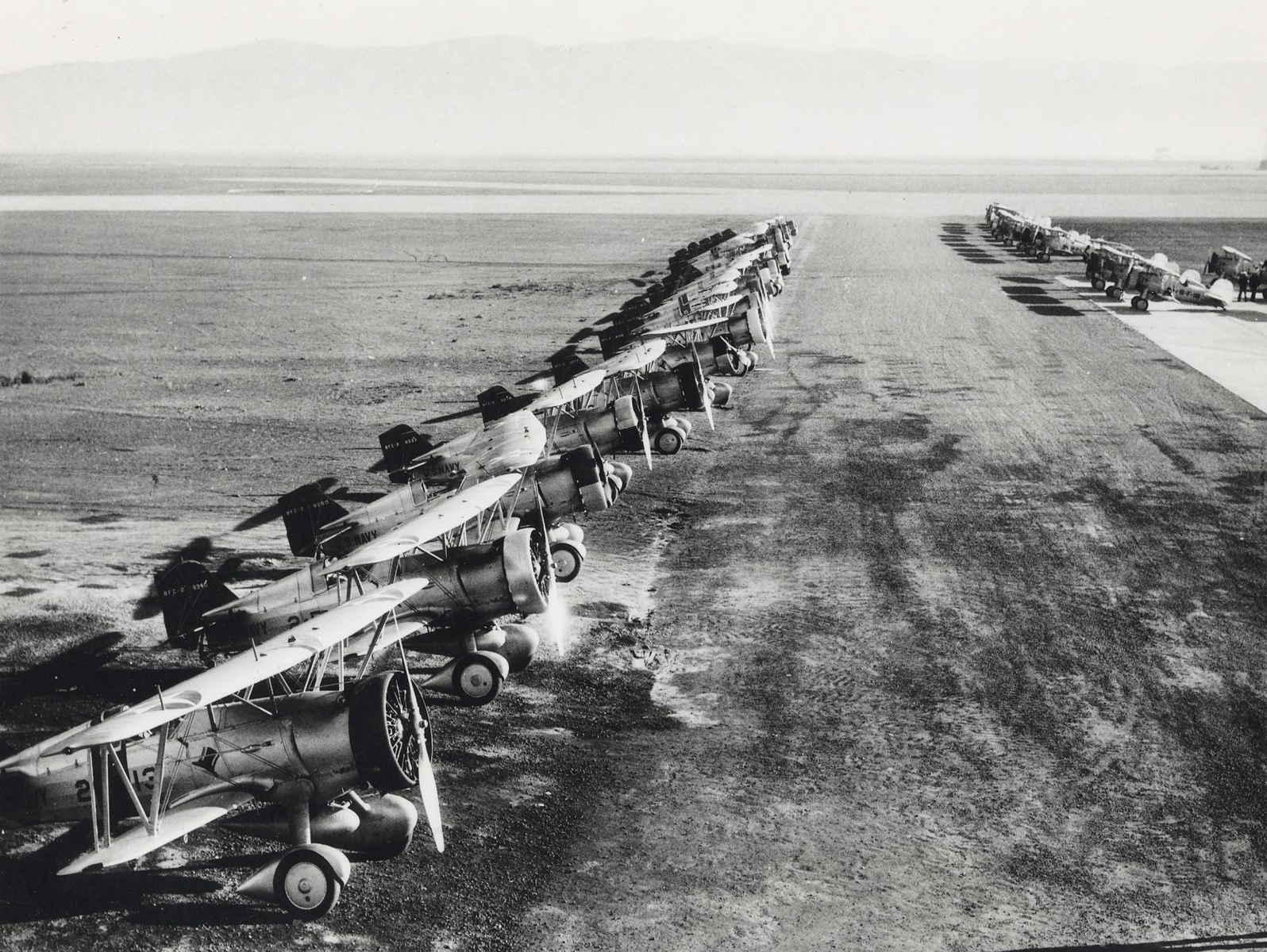 BFC-2 Goshawks assigned to the Bombing Squadron (VB) 2B High Hats line the field at NAS Sunnyvale, CA, later renamed NAS Moffett Field, during the 1930s.