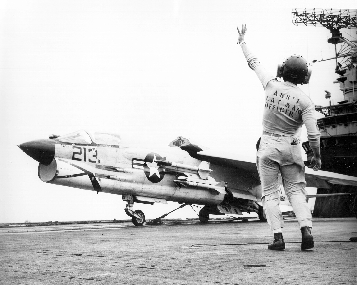 An F-8 Crusader assigned to the VF-162 Hunters prepares to launch from the deck of USS Oriskany (CVA 34) on a strike mission over North Vietnam in August 1967. Note the AIM-9 Sidewinders on the fuselage and the variable incidence wing in the raised position.