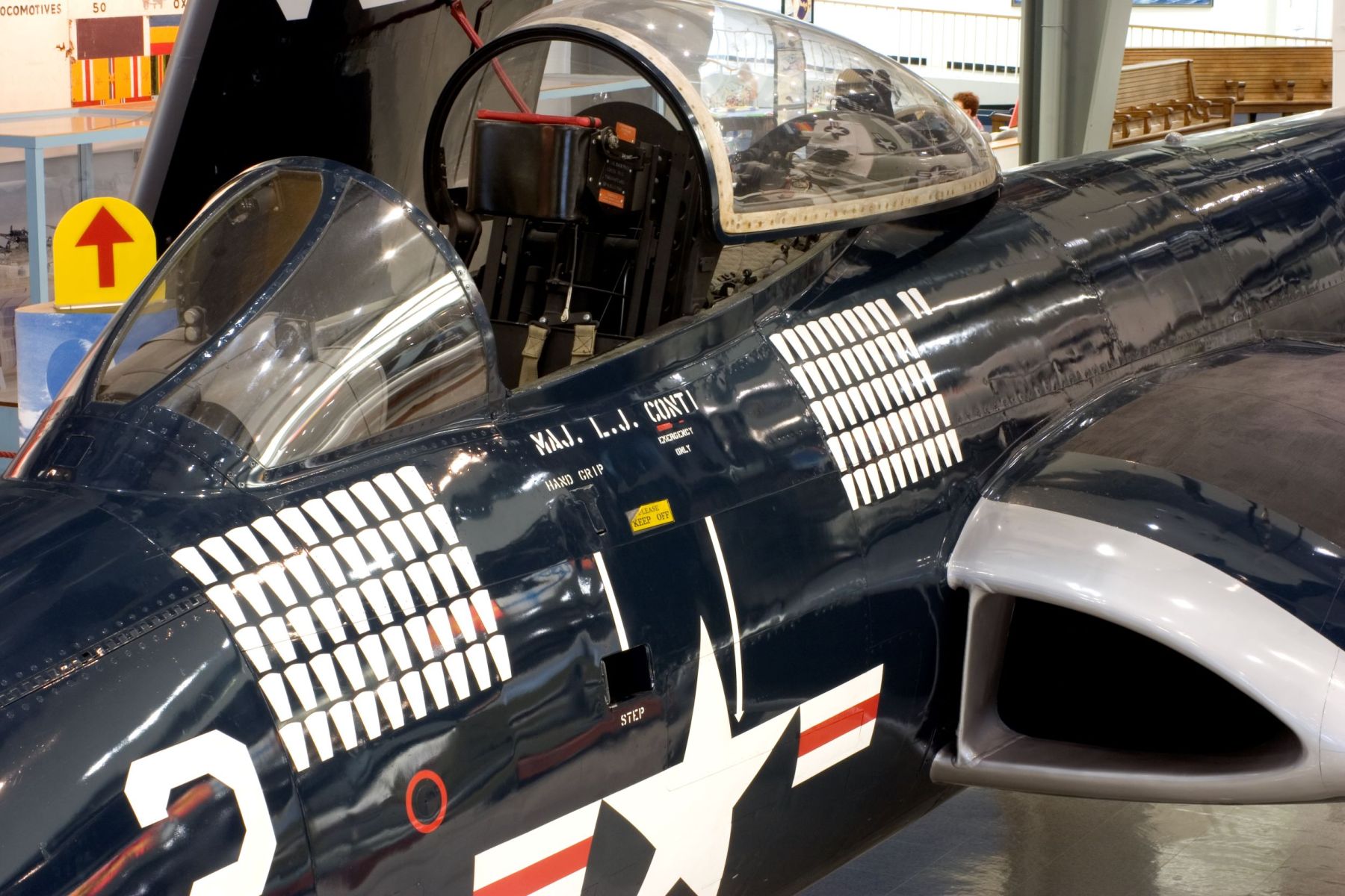 Close-up view of the cockpit section of the F2H-2P on display in the museum showing camera silhouettes denoting photoreconnaissance missions.