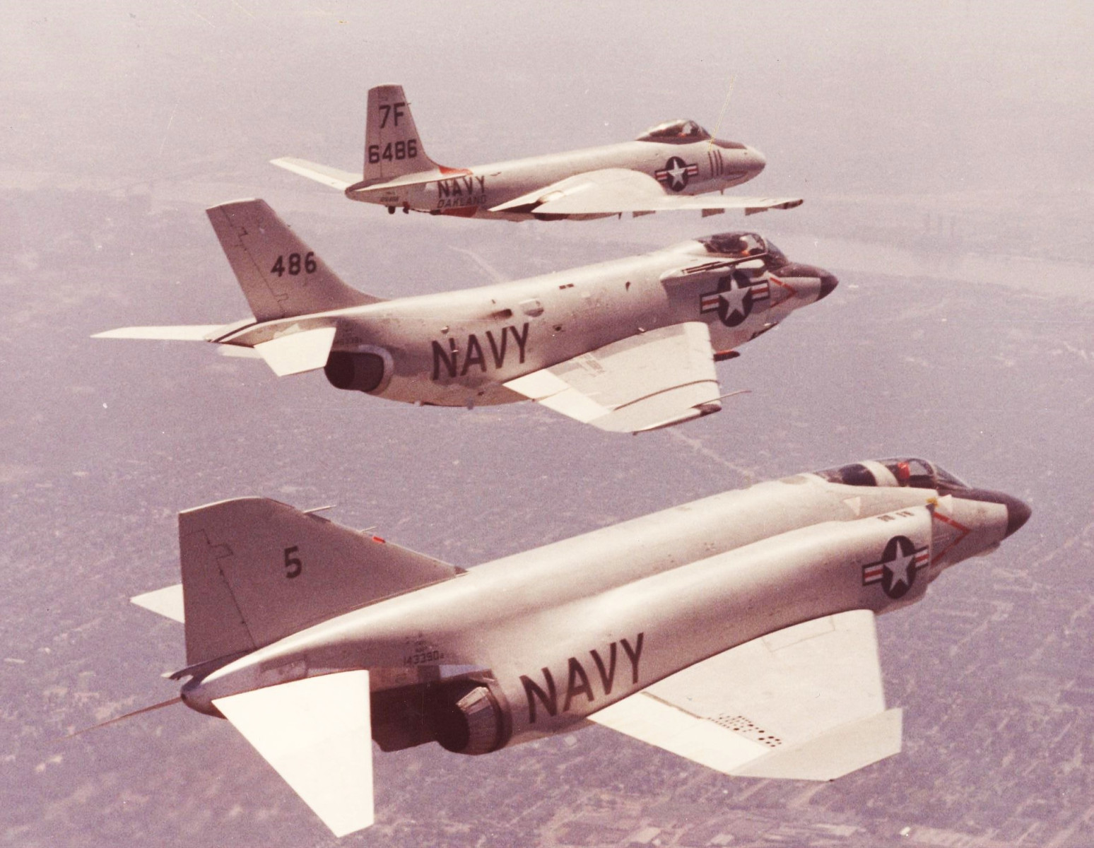 The design progression of McDonnell Aircraft Corporation fighters is displayed in a formation featuring (front to back) an F4H (F-4) Phantom II, F3H Demon and F2H Banshee.