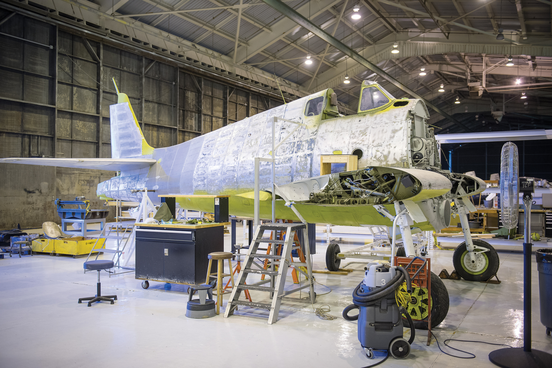 The aircraft on display (F6F-3, Bureau Number 25910) is a veteran of combat in the Solomon Islands with Fighting Squadron (VF) 38, a land-based unit that scored 22 aerial victories against Japanese aircraft. While in the squadron, the museum aircraft’s missions included flying combat air patrol for the invasion of Vella Lavella, strikes against Ballale Airfield and flying escort for an aircraft carrying Vice Admiral William F. “Bull” Halsey. Following front-line service, it operated from NAS Glenview, IL, conducting carrier qualification on board USS Wolverine (IX 64) and USS Sable (IX 81) until it crashed into the lake in January 1945 during an errant carrier landing. It was recovered in 2009 and restored to display condition.