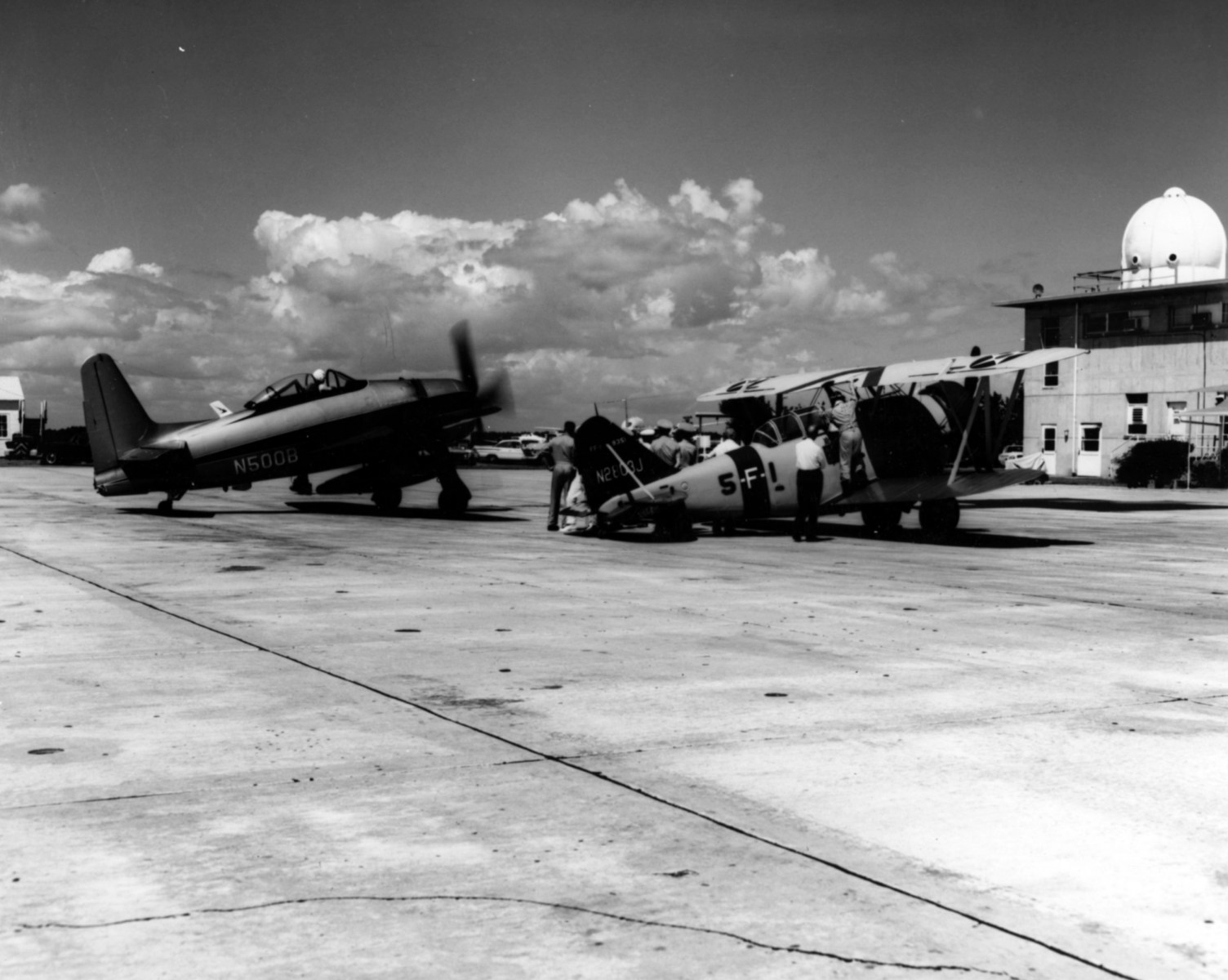 The museum's FF-1 parked at Forrest Sherman Field alongside a civilian Grumman F8F-2 Bearcat after arriving at NAS Pensacola for donation to the then-Naval Aviation Museum.