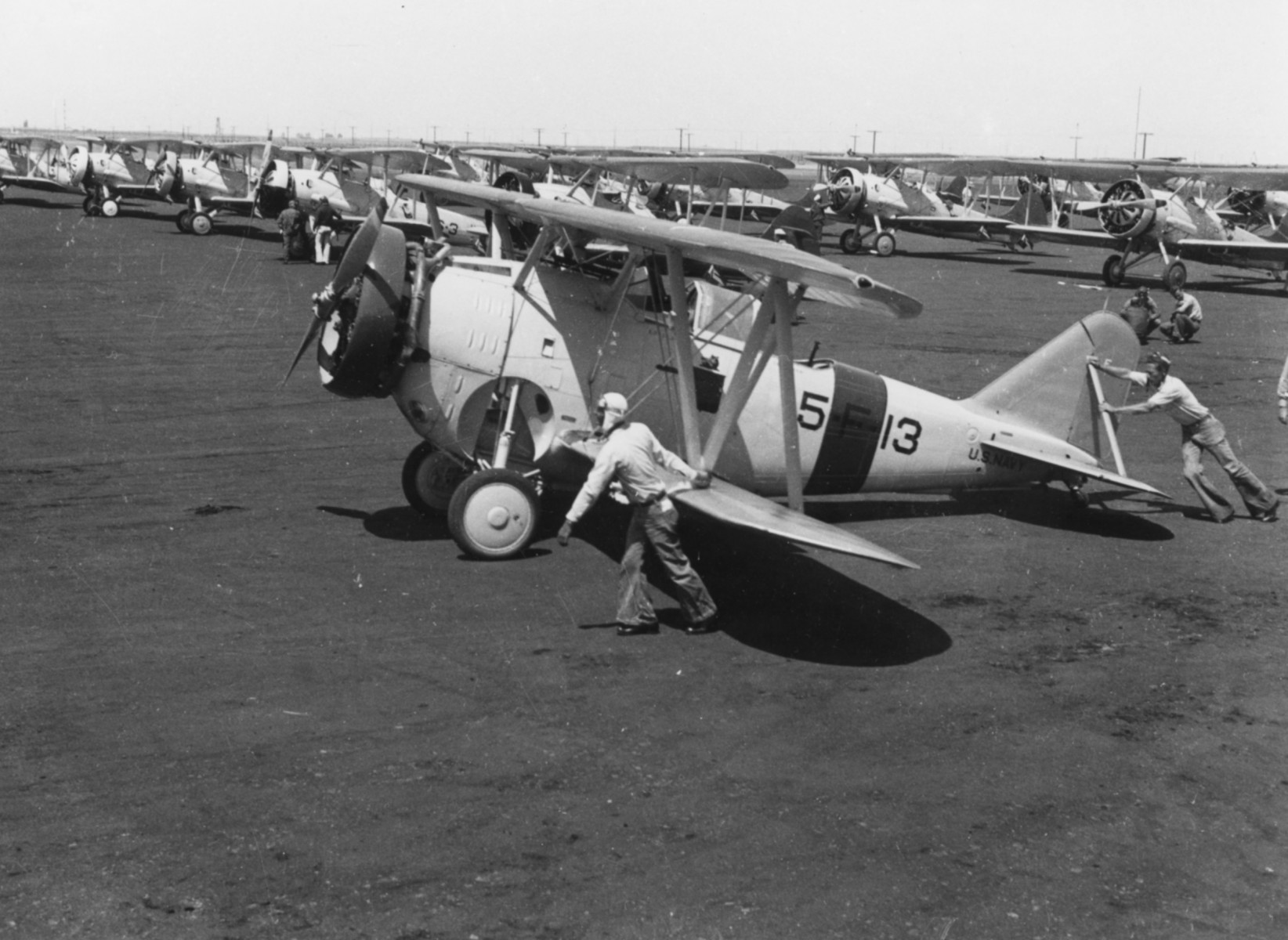 Sailors push an FF-1 assigned to the VF-5B Red Rippers at an unidentified airfield during the mid-1930s.