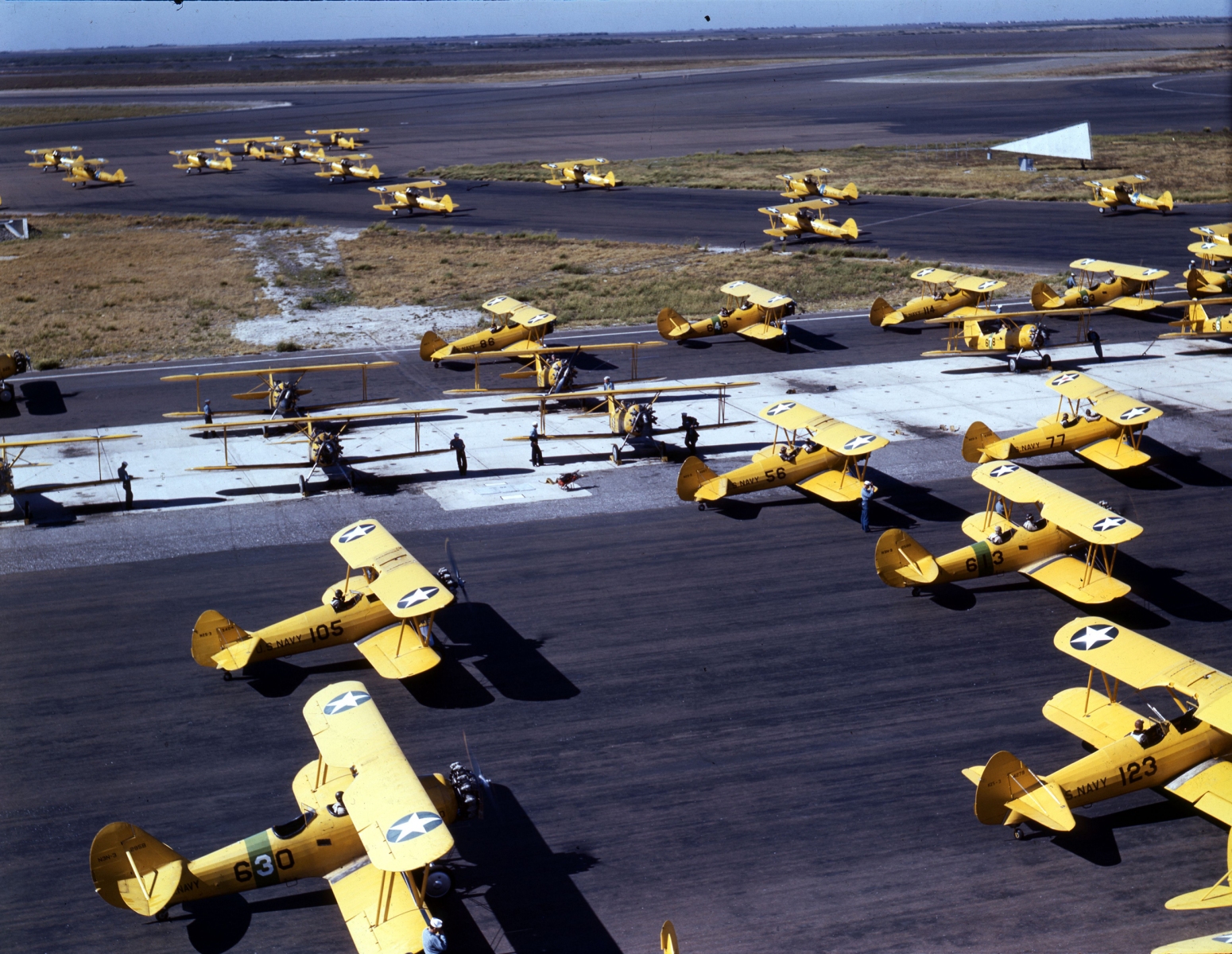 N2S biplane trainers line a runway at NAS Corpus Christi, Texas, during World War II. Those who lived in the vicinity of training bases during the war recalled the constant sound of buzzing from the engines of trainers preparing young men to go off to war.