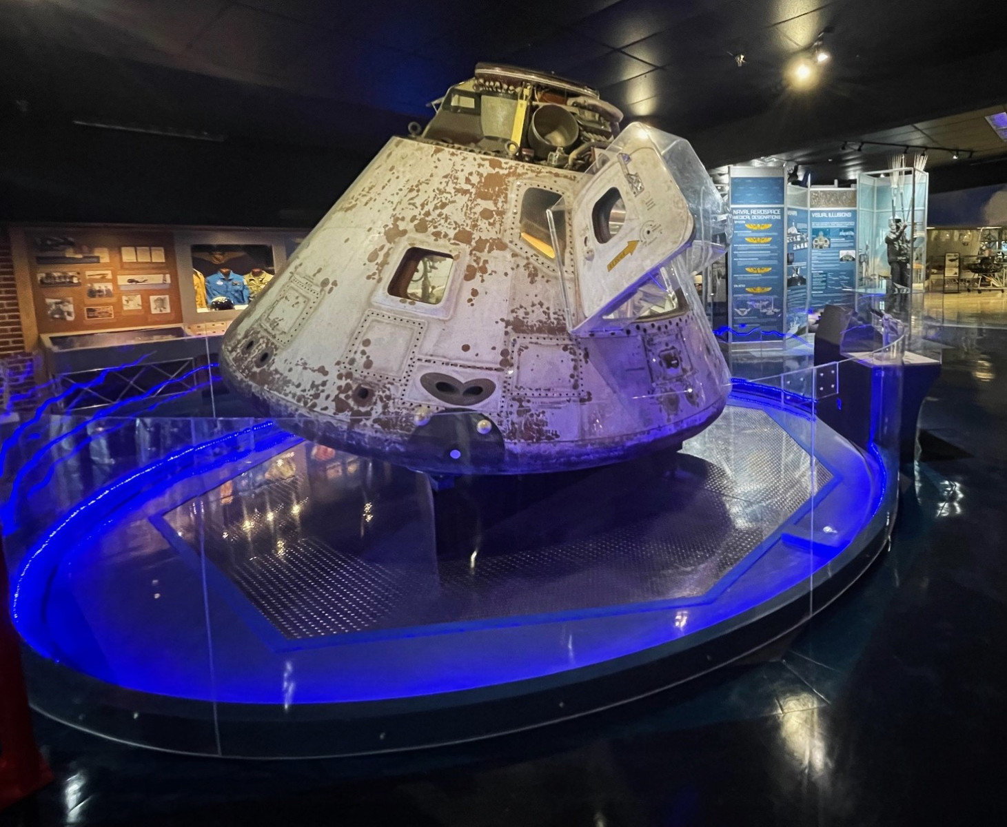 On Tuesday, October 29, 2024, nearly 150 people, including both active duty and retired military personnel, assembled at the National Naval Aviation Museum to open a new exhibit devoted to the history and current role of aerospace medicine in support of Naval Aviation. As Museum Director CAPT Sterling Gilliam, USN( (Ret.) stated in his opening remarks, while “NAS Pensacola is know as the ‘Cradle of Naval Aviation,’ it is also the ancestral home of naval aerospace medicine.” The new exhibit speaks to that history with a timeline of events beginning with the assignment of the first Navy physicians for training in aviation medicine in 1922 (ironically, they received instruction from the Army) to the modern age. Notable artifacts featured in the historical section include medical devices that belonged to CAPT Robert Mitchell, MC, USN, who founded the ongoing study of former prisoners of war. Also displayed is the NASA flight jacket that belonged to CAPT Joseph C. Kerwin, MC, USN (Ret.), the first flight surgeon in space. The Skylab II command module in which he flew is exhibited nearby courtesy of the Smithsonian National Air and Space Museum. CAPT Kerwin taped a special message that was part of the program for the exhibit opening.