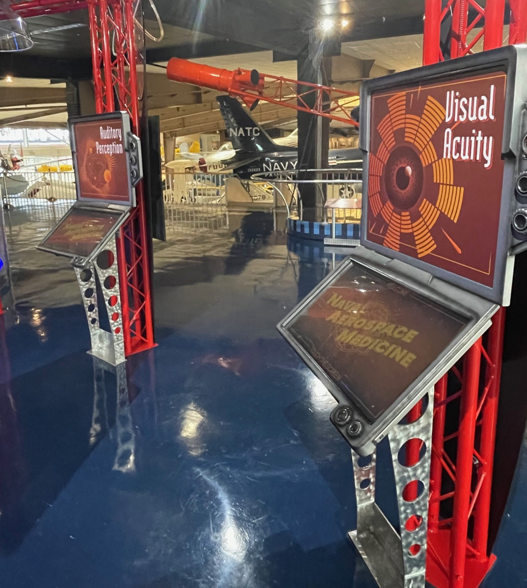 The exhibit also touches on the operational aspects of Naval Aerospace Medicine in the fleet. Visitors can step up to interactive touchscreen kiosks to test their vision and hearing and learn if they are “fit to fly.” An example of the famous “Dilbert Dunker” introduces naval aerospace medicine’s role in water survival training and graphics panels cover an array of other subjects to include the psychological and physiological aspects of flying.