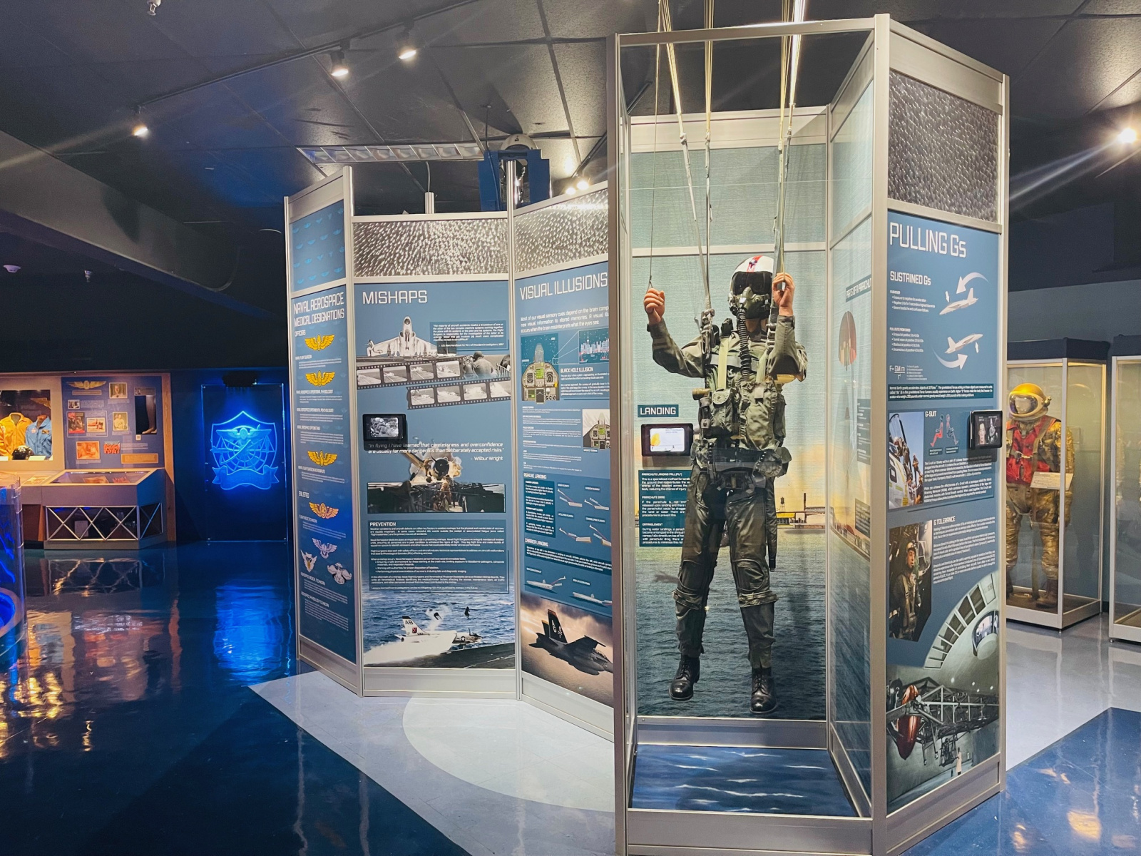 The exhibit also touches on the operational aspects of Naval Aerospace Medicine in the fleet. Visitors can step up to interactive touchscreen kiosks to test their vision and hearing and learn if they are “fit to fly.” An example of the famous “Dilbert Dunker” introduces naval aerospace medicine’s role in water survival training and graphics panels cover an array of other subjects to include the psychological and physiological aspects of flying.