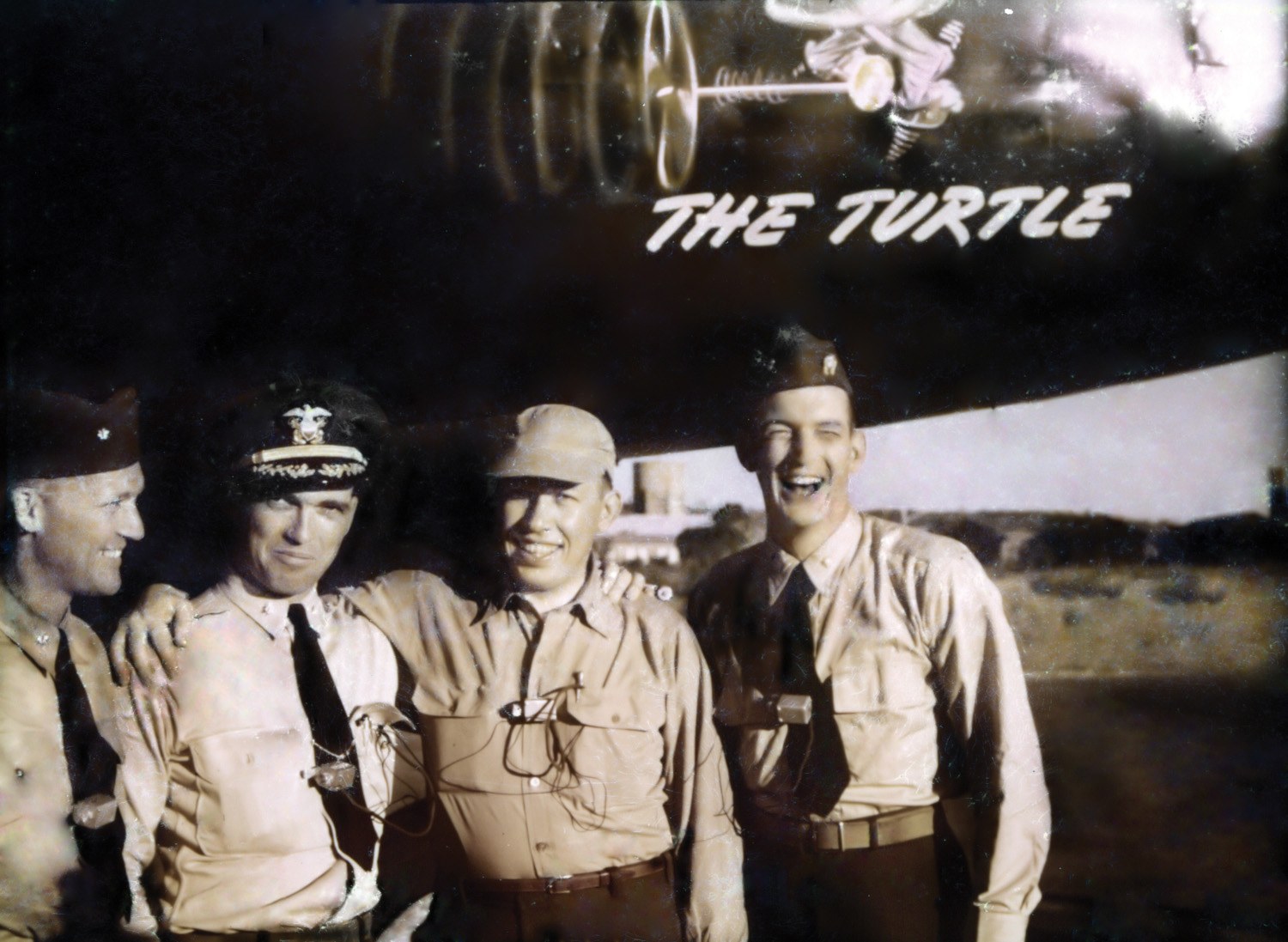 A rare color photograph showing the crew of the record-setting P2V-1 Neptune, nicknamed the "Truculent Turtle."