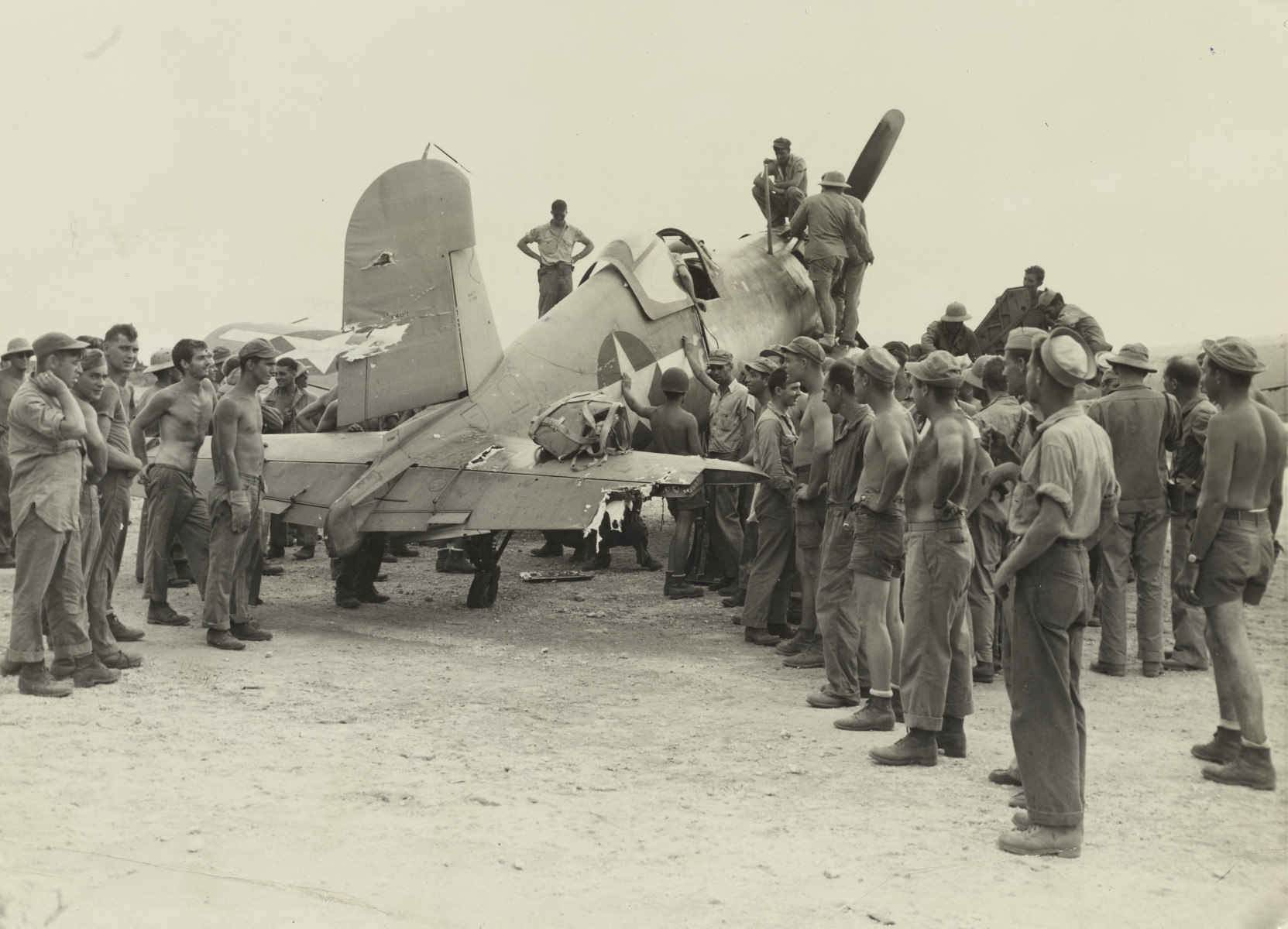 "Shot Up, But Not Shot Down" was the beginning of the wartime caption of this photograph showing personnel swarming around a battle-damaged Marine Corps F4U Corsair after it returned to Bougainville following a strike on Rabaul.