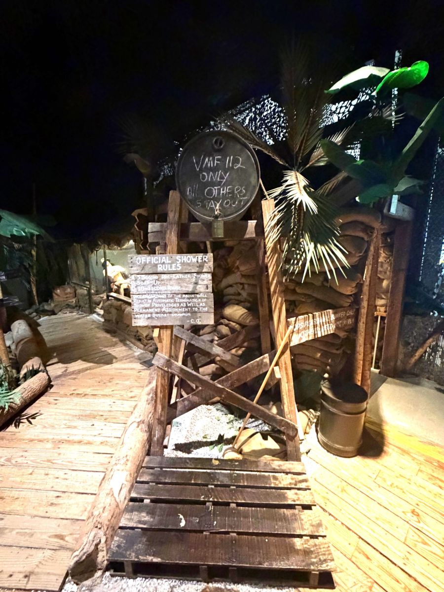 Language of the type used in wartime signage provides additional authenticity to the recreation of a shower using water housed in an oil barrel.
