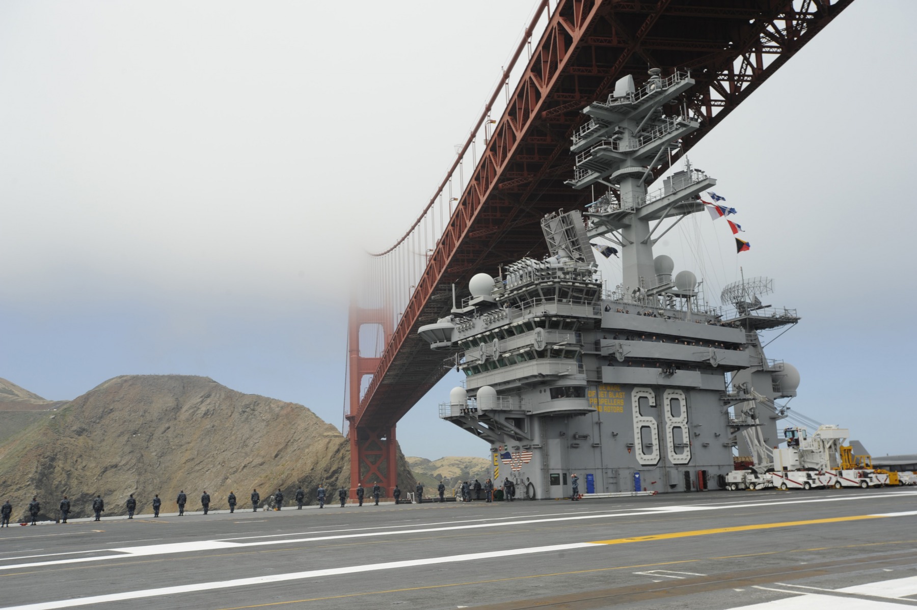 Sailors man the rails on board USS Nimitz (CVN 68) as the ship passes beneath the Golden Gate Bridge after a port call in San Francisco in May 2012.