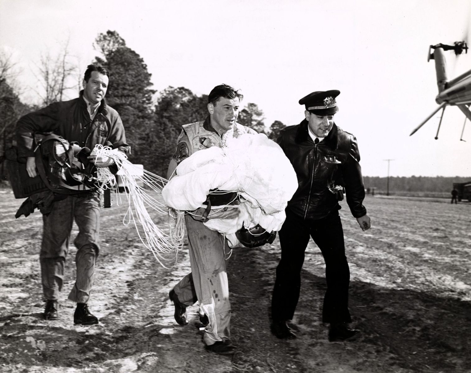 Lieutenant (junior grade) T.D. Tomko assigned to Attack Squadron (VA) 85 carries his parachute to a rescue aircraft after bailing out of his AD Skyraider after it caught fire during a training flight over the coast of North Carolina in 1954.