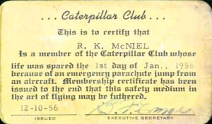 The Caterpillar Club formed at Wright Field in Dayton, OH, in October 1922, after Army Air Service First Lieutenant Harold R. Harris bailed out of an airplane after it went out of control. An engineer on the base, Milton H. St. Clair, and two local journalists, Verne Timmerman and Maurice Hutton, thought that with more such escapes inevitable, there should some recognition. The name of the club derived from the fact that parachutes were made of silk produced from the cocoon of a caterpillar.