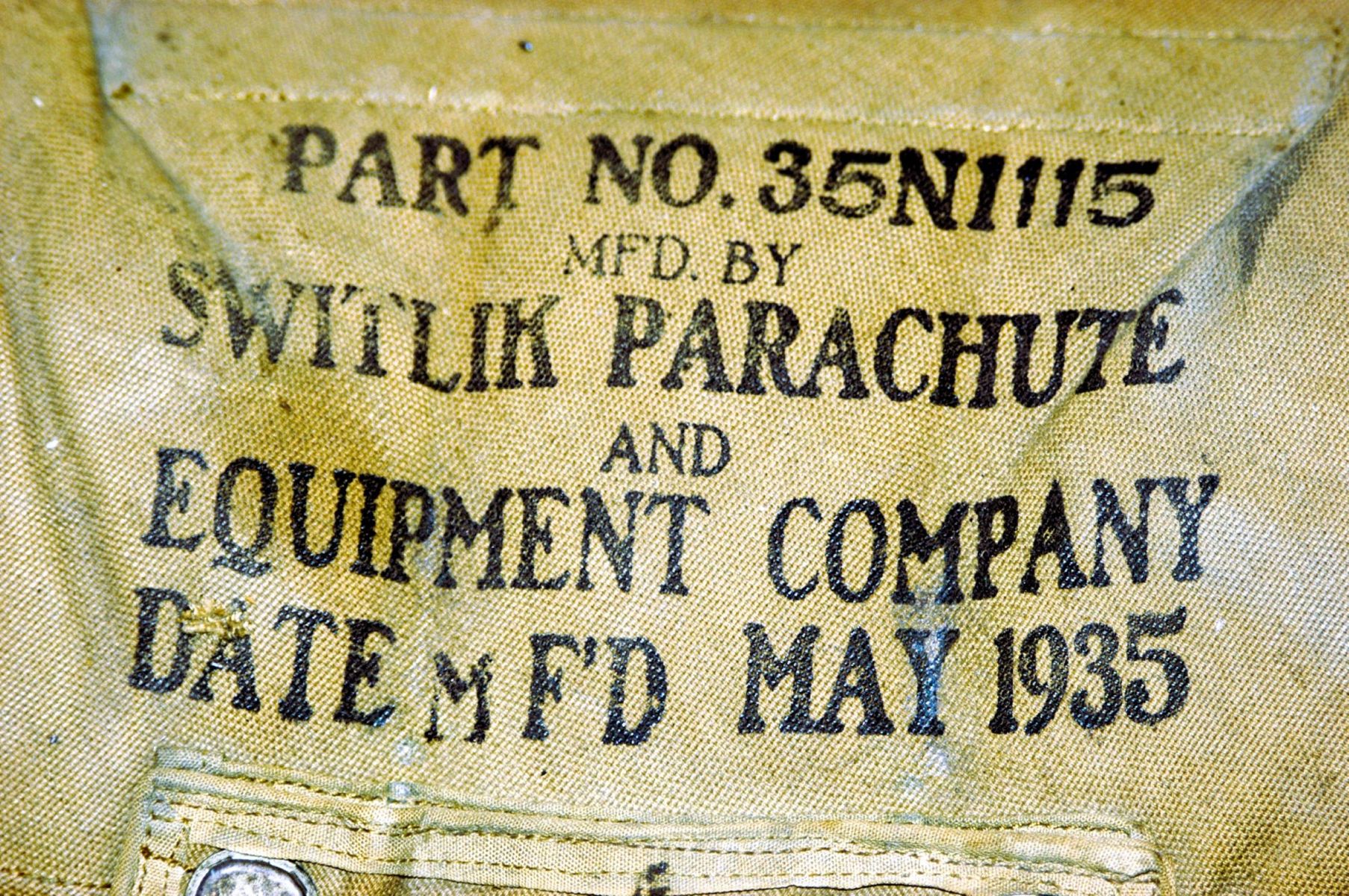 Stenciling on a parachute manufactured by the Switlik Parachute and Equipment Company in 1935. Originally founded as a canvas and leather manufacturer, Switlik was by the 1930s the largest manufacturer of parachutes in the United States.