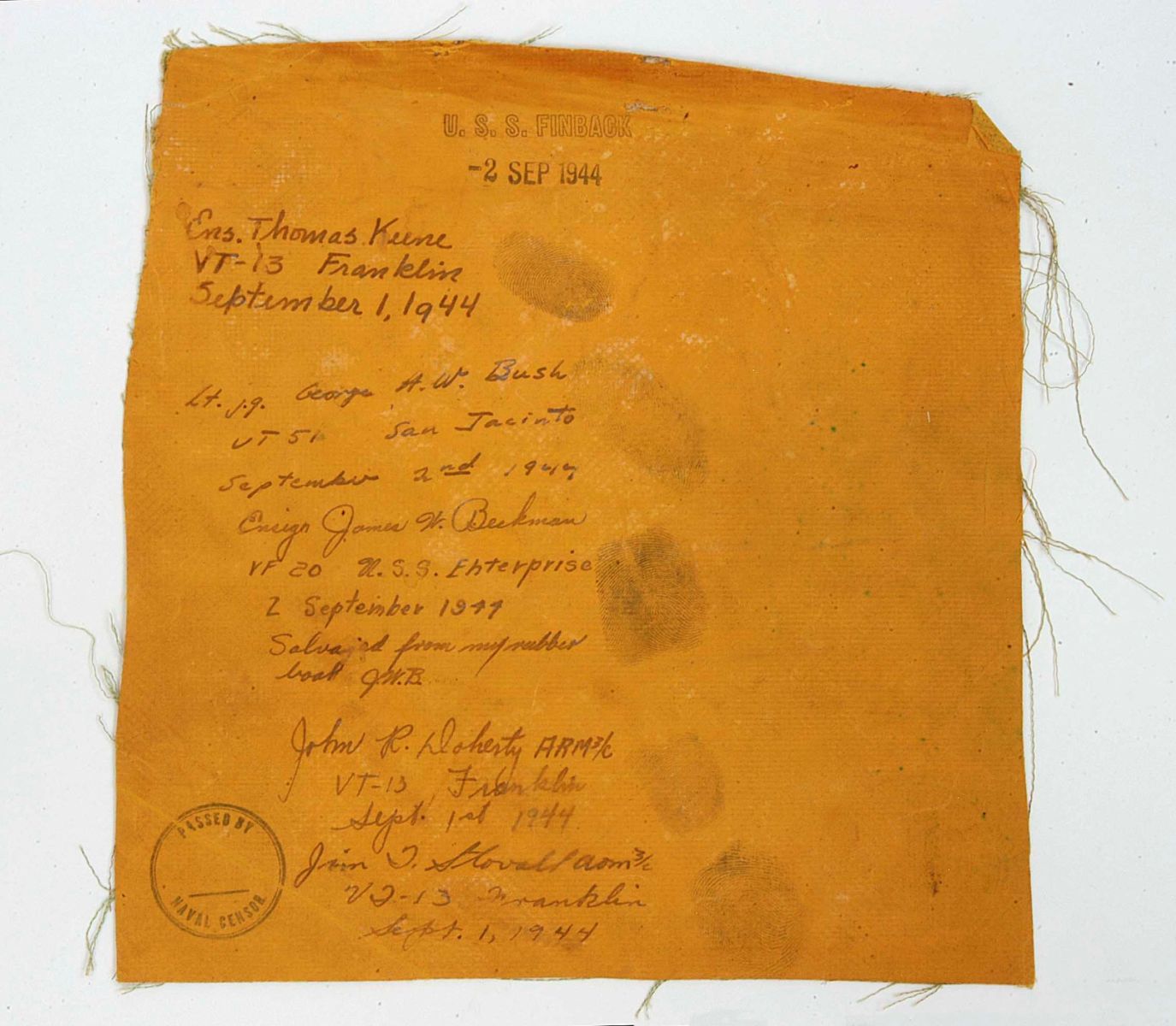 Section of life raft autographed by aviators and aircrewman rescued by the submarine USS Finback (SS 230) off Chichi Jima on September 2, 1944. All became eligible for either the Caterpillar or Goldfish Clubs depending on whether they parachuted from their aircraft or made a water landing, including future U.S. president Lieutenant (junior grade) George H.W. Bush.