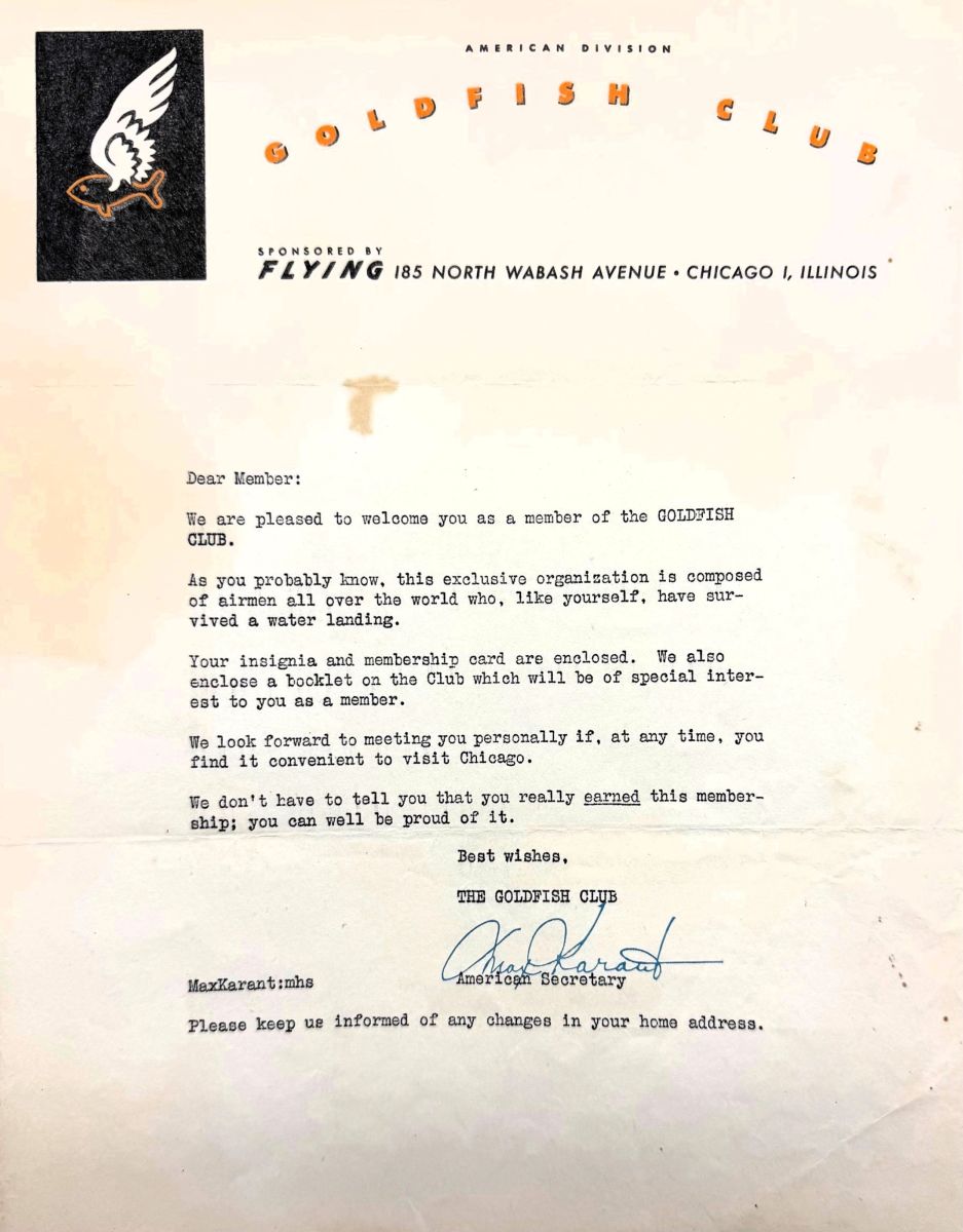 A letter from the American Division of the Goldfish Club welcoming a new member.